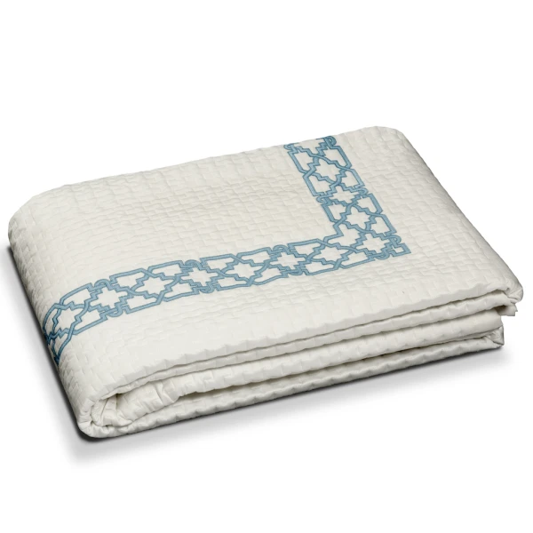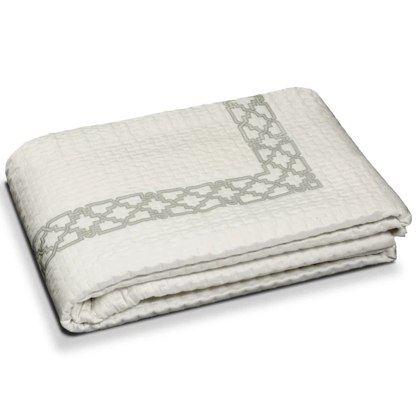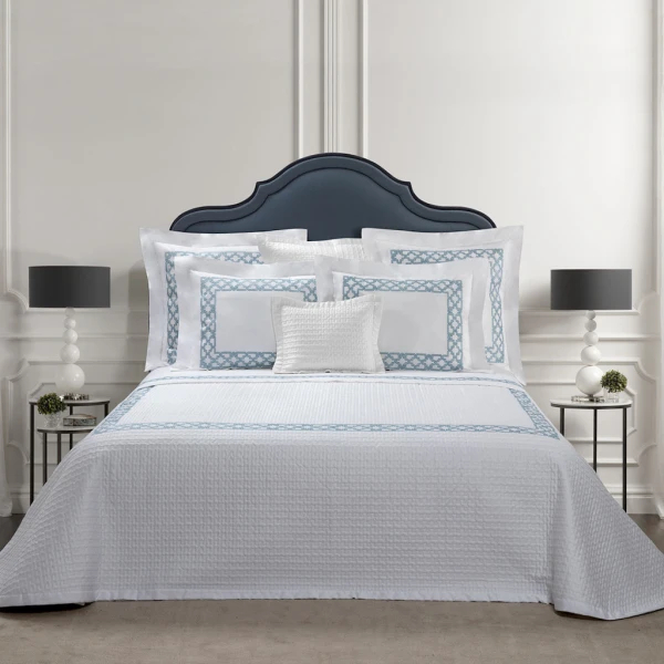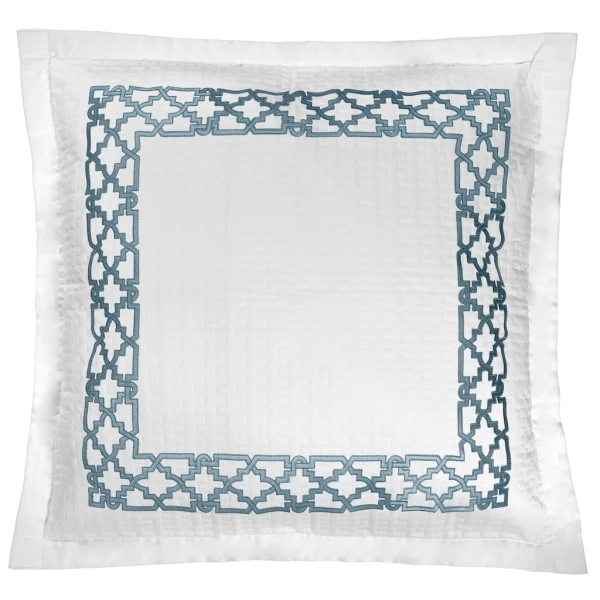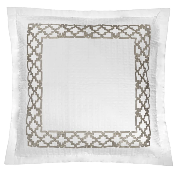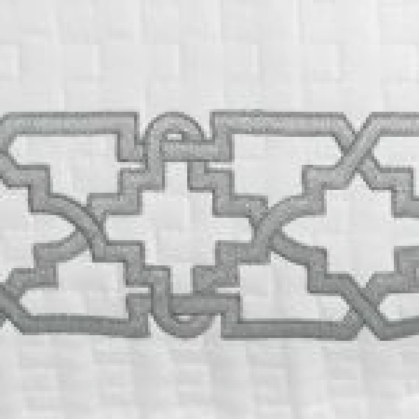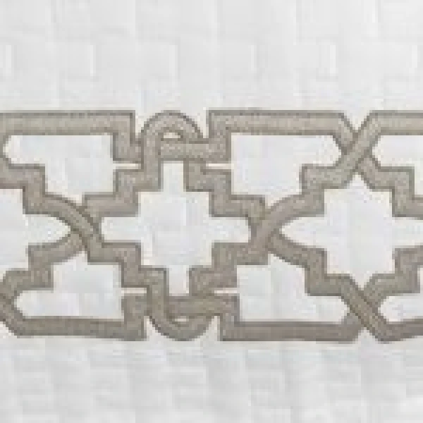 Timothy Corrigan for Dea's Fretwork Embroidery Positano Quilt is sophisticated. Fretwork has a modern key pattern. This collection offers a blend of the most famous traditional Italian embroideries using variances on the sateen stitch. This is the typical character of Italian craftsmanship. 100% CO.