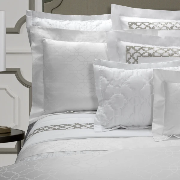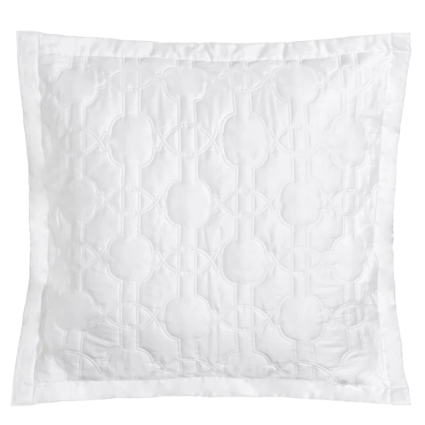Timothy Corrigan for Dea's Fretwork Embroidery Quilted Coverlet has modern key pattern. This modern embroidery is composed of full-stitch embroidered lines that intertwine to form a frame on the white canvas of fine cotton. Fretwork is a contemporary rendering of Tuscan craftsmanship, where embroidery is an ancient art. 100% CO.