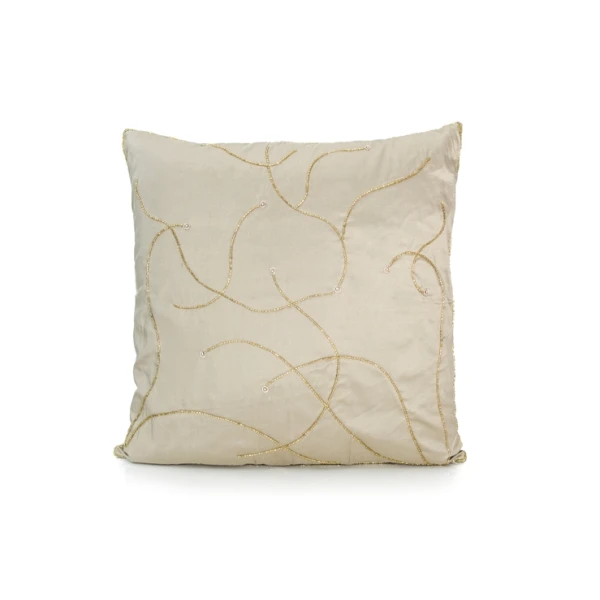 Inspired by a vintage sari adorned by a distinguished Indian woman, gold beads meander into petite circles as an ode to the bindi, they trail across the taupe hue silk. One of our most popular Pyar & Co pillows -- works in a lot of interiors. In stock.