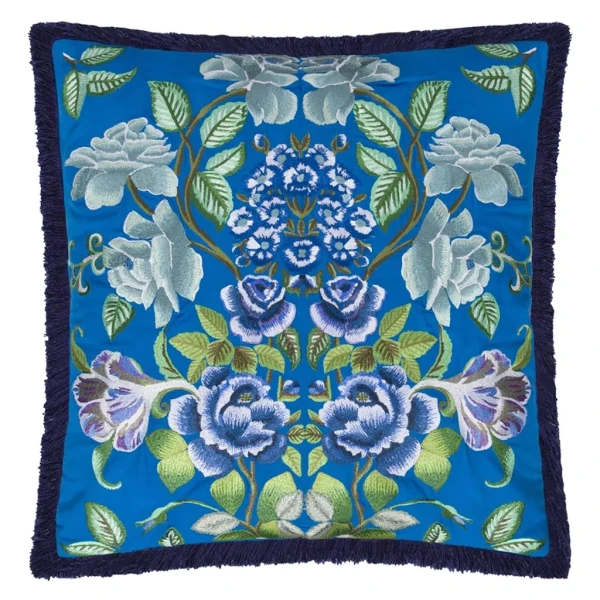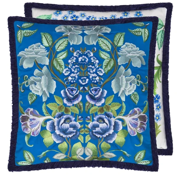 Designers Guild's Eleonora Embroidered Cobalt Cotton Pillow has exquisite flowers, foliage and butterflies that are fully embroidered in an artful kaleidoscopic mirrored form to create a contemporary floral decorative pillow. In rich blue tones, this luxurious decorative square pillow with fully embroidered front reverses to a digitally printed pattern on cotton. Finished on all sides with a striking fringed trimming. 100% cotton. Dry Clean Only.
