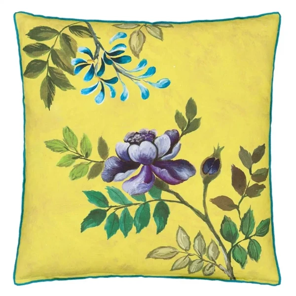 Designers Guild's decorative pillow Porcelaine De Chine Alchemilla has detailed and intricate paintings of trailing flowers and birds evoke the magic of fine porcelain in this large square decorative pillow. Digitally printed onto pure tumbled linen this stylish floral decorative pillow in alchemilla yellow is finished with an overlocked edge detail.  100%Linen.