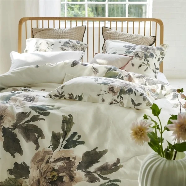 Designers Guild's Shanghai Garden is soft and romantic.  It is is adorned with painterly and expressive roses and peonies in soft neutral tones. In a dramatic statement scale, this luxurious floral bedding is digitally printed onto pure linen with a white linen reverse. Shams finished with a smart linen color trim detail. OEKO-TEX Standard 100 approved for added confidence. 100% Linen.