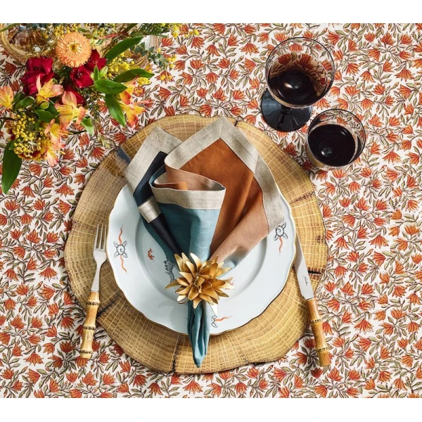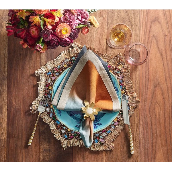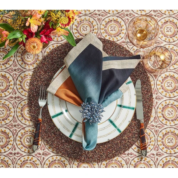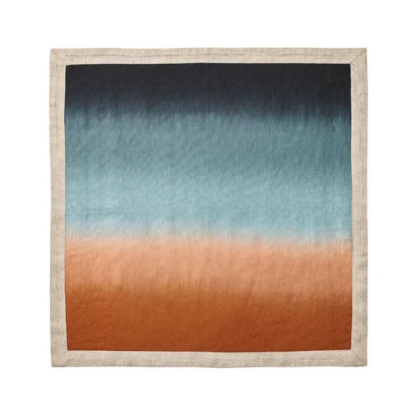 Kim Seybert's Dip Dye Napkins offer a display of ombre gradation from Midnight to Copper, adding a subtle elegance to the refined linen napkin. This stunning color combination complements any fall table. These linen napkins are hand-dipped and dyed and accented with a luxurious metallic foil border.  100% linen