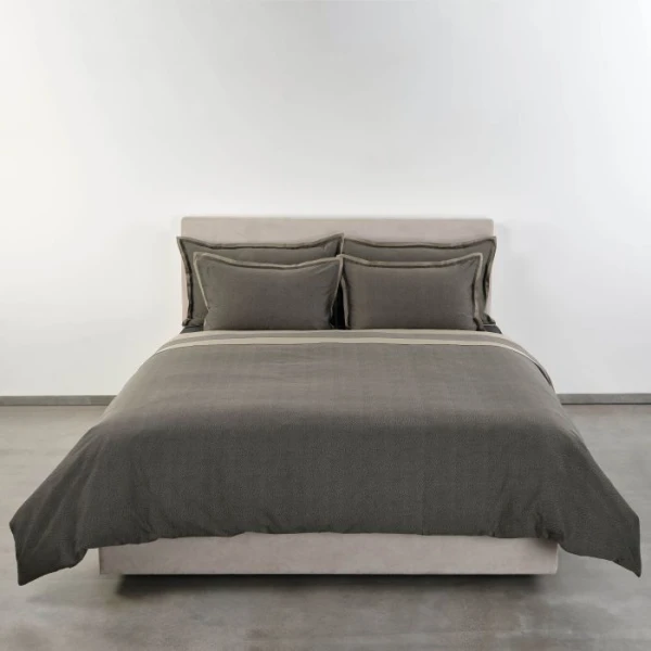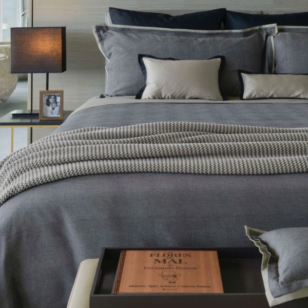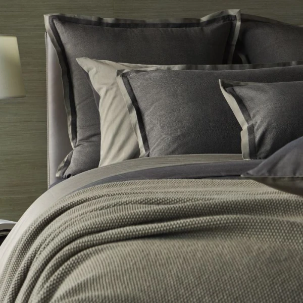 Duvets have a knife edge finish and reverse to a solid while all pillowcases have a 1/4" flange. The flat sheets have a plain hem all around with a mitered corner finish. Use Calypso for the fitted sheets. 650 thread count, 100% Giza extra long staple Egyptian cotton sateen jacquard.