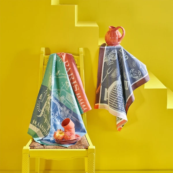 Garnier Thiebaut's BBQ De La Mer Bleu Tea Towel is a delight. It evokes memories of roasted seafood at a BBQ along a blue ocean coastline. 22"x30". 100% extra-long staple cotton with hook label. Made in France.