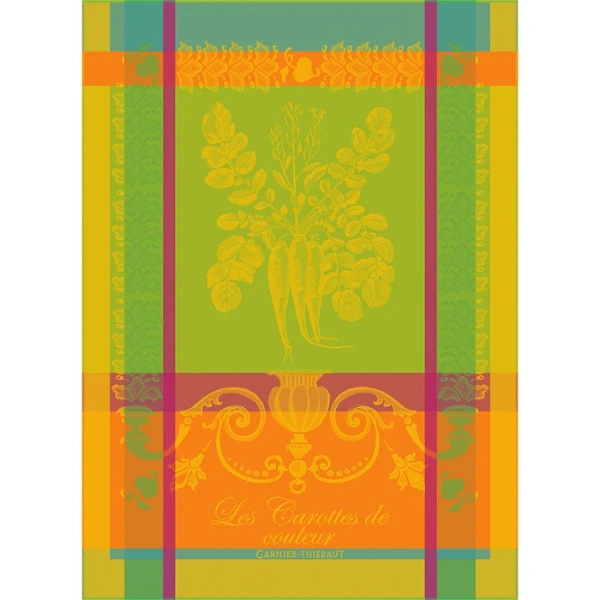 Garnier Thiebaut's Carottes De Couleur Zeste Tea Towel is a stunning. A beautiful bunch of bright orange carrots set the stage for this lime green, yellow and orange tea towel. 22"x30". 100% extra-long staple cotton with hook label. Made in France.