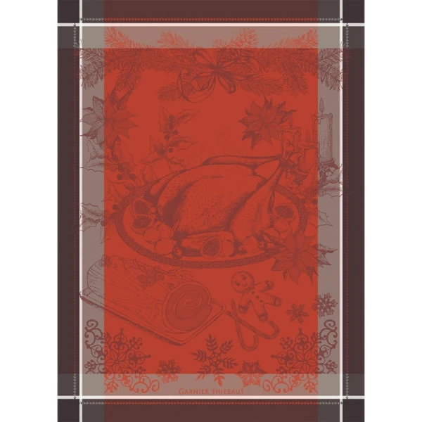 Garnier Thiebaut's Dinde De Noel Vermillon tea towel has a turkey dinner surrounded by snowflakes and various sweets like gingerbread, candy canes, and a yule log cake. This towel is in orange, brown, and grey. This woven design was crafted from original artwork, hand-drawn by our in-house team of textile artisans & designers in France. A perfect final touch as you prep for your family Thanksgiving, and Christmas dinners, the Dinde De Noel Vermillon Kitchen Towel is a great option that can be used for many holidays to come. 22"x30" with hook label. 100% extra-long staple cotton with hook label. Made in France.