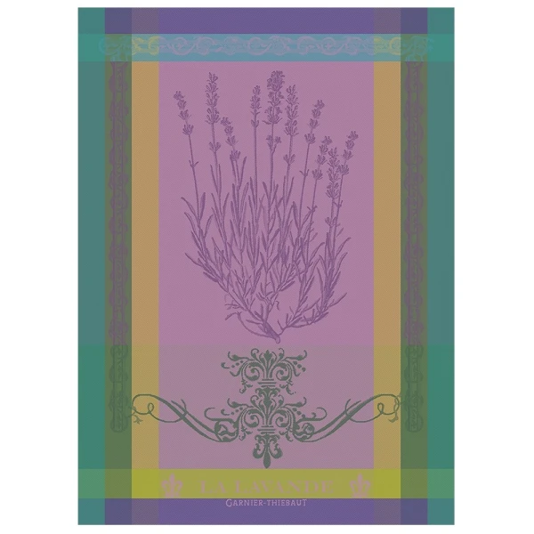 Garnier Thiebaut's Lavande Mauve depicts one of France's best know herb.  Dainty yet robust Lavender is front and center enclosed by a detailed border.  Colors are purples, greens and gold. Garniet Thiebaut Tea Towels are the perfect way to add pops of color and a hint of French Style in your kitchen or powder room.  I find they make great guest towels. 100% extra-long staple Cotton Jacquard. Made in France.