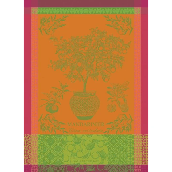 Garnier Thiebaut's Mandarinier en Pot orange Tea Towel is so truly delicious with its citrus colors.  A Mandarin Tree showing off its offering of delicious fruit in a geometric patterned cache pot.  The towel is woven in oranges hues and greens with accents of fuchsia. 100% cotton jacquard woven in France.