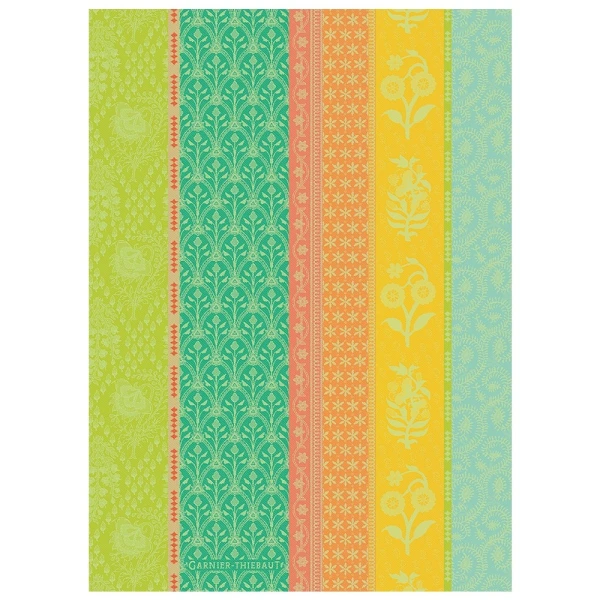 Garnier Thiebaut's Mille Saris Kerala is a collection of citrusy colored and elaborate floral columns.  The colors are greens and oranges.   Garniet Thiebaut Tea Towels are the perfect way to add pops of color and a hint of French Style in your kitchen or powder room.  I find they make great guest towels. 100% extra-long staple Cotton Jacquard. Made in France.