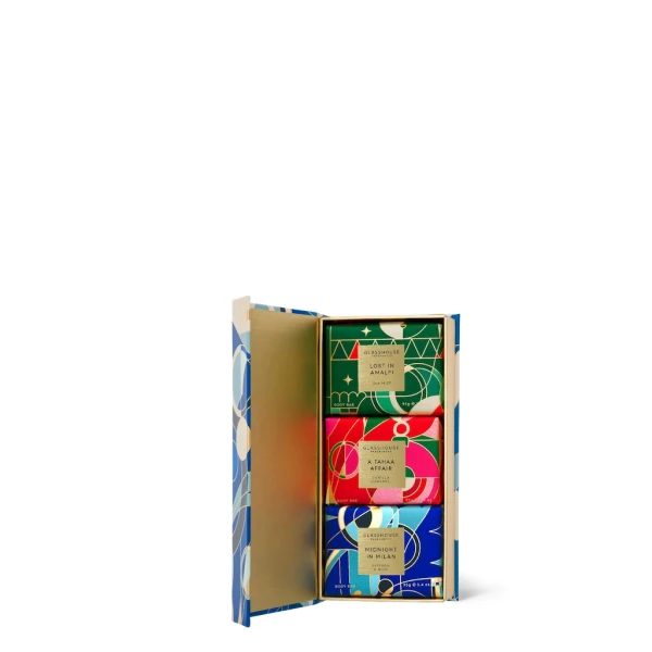 Glasshouse Fragrances Body Bars in the Trio Christmas are all wrapped up in a festive Gift Box with illustrations by Eirian Chapman. They are rich in almond oil, vitamin E and shea butter to leave your skin soft and sweetly scented. What makes French triple milled so special? French triple milled soap is passed through a milling machine of smooth stainless steel rollers three times, producing a bar that is thoroughly mixed and free of air and excess moisture. The result is a firm, long lasting body bar which retains its shape, and delivers a luxurious, foamy lather. No parabens. No silicones. No sulphates. Not tested on animals.