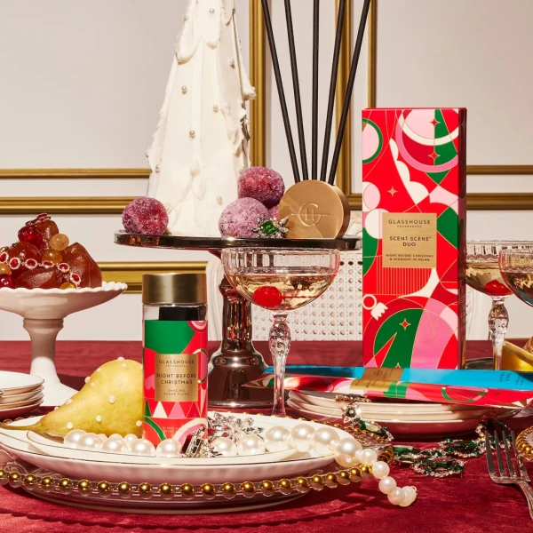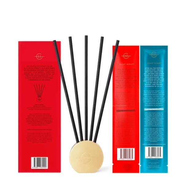 Glasshouse Christmas Scent Sceneâ„¢ Duo includes two individually packaged Scent Stemsâ„¢ fragrances: Midnight In Milan, and our festive floral scent Night Before Christmas plus one brushed Metal Vessel.