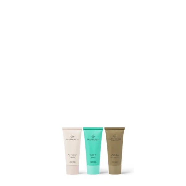 Contains 1 x Kyoto In Bloom 1 fl. oz. Hand Cream, 1 x Lost In Amalfi 1 fl. oz. Hand Cream, 1 x Marseille Memoir 1 fl. oz. Hand Cream all wrapped in Gift Box with designs by Aeoniumsky.