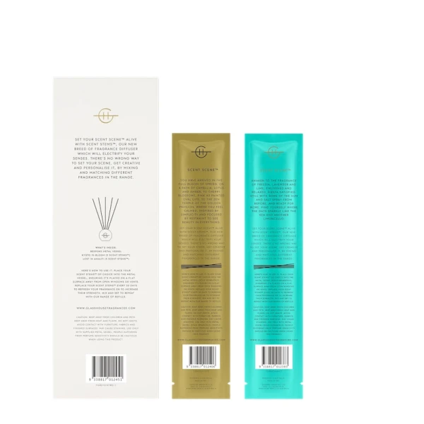 The Scent Sceneâ„¢ Duo includes two individually packaged Scent Stemsâ„¢ fragrances: Kyoto in Bloom Camellia & Lotus and Lost in Amalfi Sea Mist plus one Bespoke Metal Vessel.