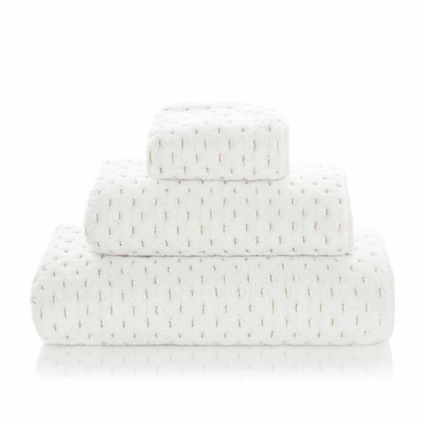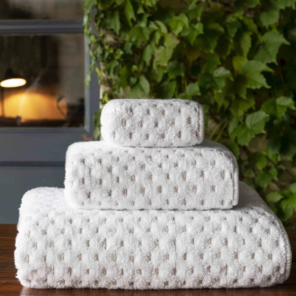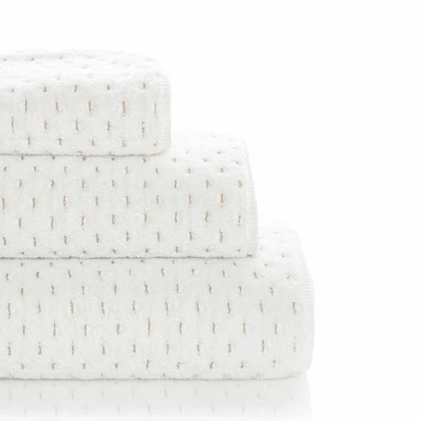 Alice is a contemporary white bath towel with small lines of embroidery thread woven into the towel in a warm beige.  As per Graccioza standards, these are extremely soft towels produced with the finest cotton. Soft to the touch and skin.