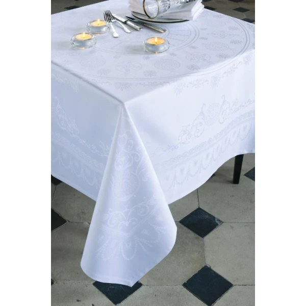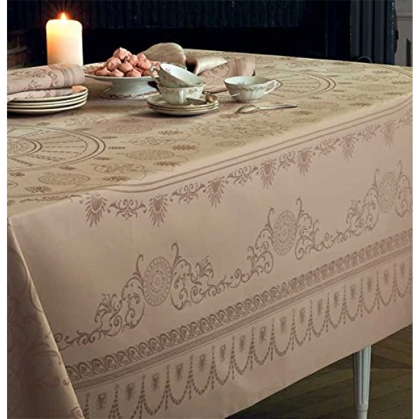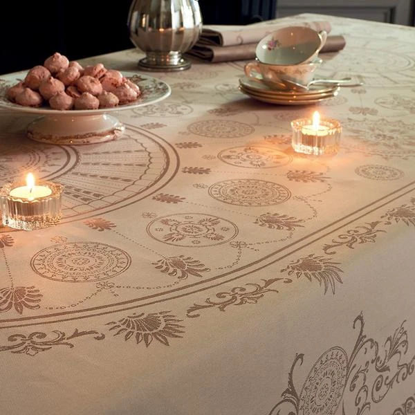 twisted cotton, Green Sweet Stain Resistan. A traditional, classic pattern that celebrated the finer things in life. Available in . Sizes include 69 and 96" rounds.