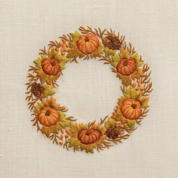 A beautiful fall wreath is adorned with pumpkins. Hand embroidered towel on 100% ivory linen, finished with a hand-drawn grande hemstitch.