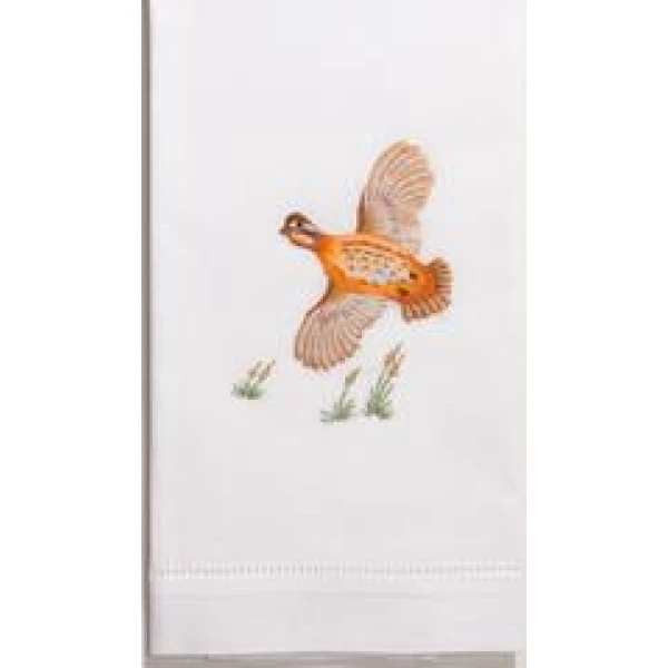 A bird hunter's favorite -- a quail in flight is hand embroidered towel on 100% white cotton, finished and hemstitched by hand. Made in Vietnam and imported.