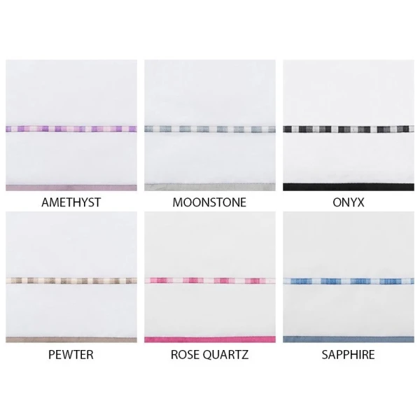 Home Treasures' Calypso on Royal Sateen is a visually vibrant addition to any bedroom. This Egyptian cotton collection features an ombre embroidered satin stitch and coordinating piped edge for a tailored, yet playful finish. Duvet Covers have knife edge finish and button closure. Fitted sheets are solid white sateen. 300 thread count. Egyptian cotton. Italian sateen fabric. Made in USA