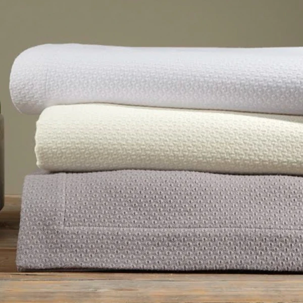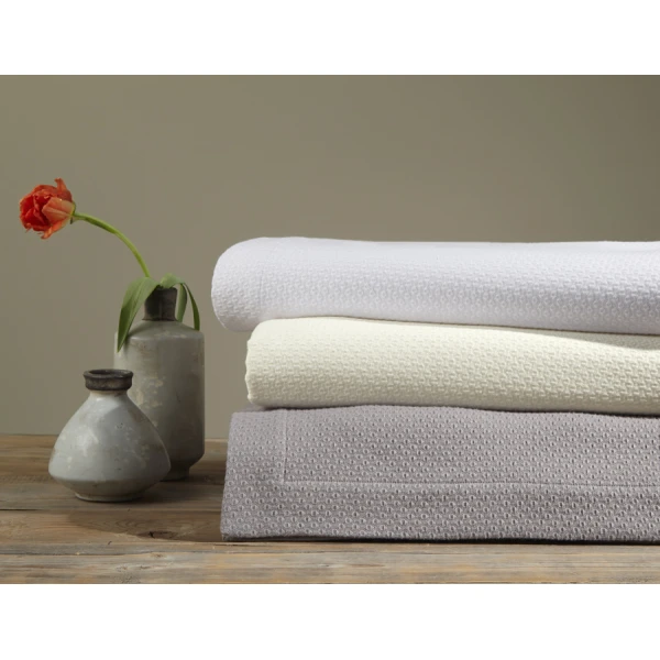 Home Treasure's Lisboa is a collection not only comfortable but sophisticated as well. 100% cotton, it is breathable and gives this blanket a special appeal. Available in three colors. Zero twist cotton. Doubles as a coverlet. Made in the USA from fabric imported from Portugal.