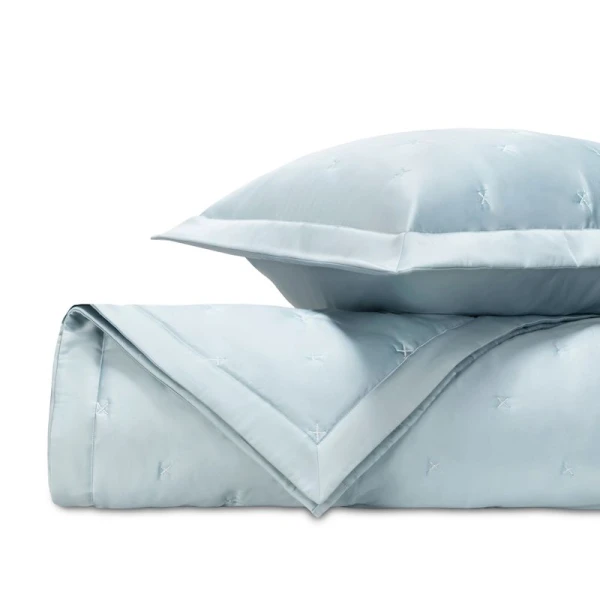 Quilt is in Croix quilting pattern. Bed Cover has a 2" border and Shams have a 2" flange.