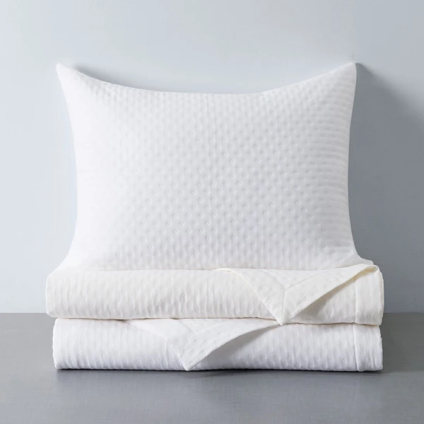 Home Treasures' Nimbus is a light and airy blanket that brings elevated comfort.   Nimbus feels light as clouds which is will give you the perfect lightweight feel for year-round bedroom bliss. Blankets are finished with a 2" self hem and shams are knife edge finished and have a zipper for closure.  100% cotton.  Made in the USA of Italian fabric.  Can be used as a coverlet on top of the bed.