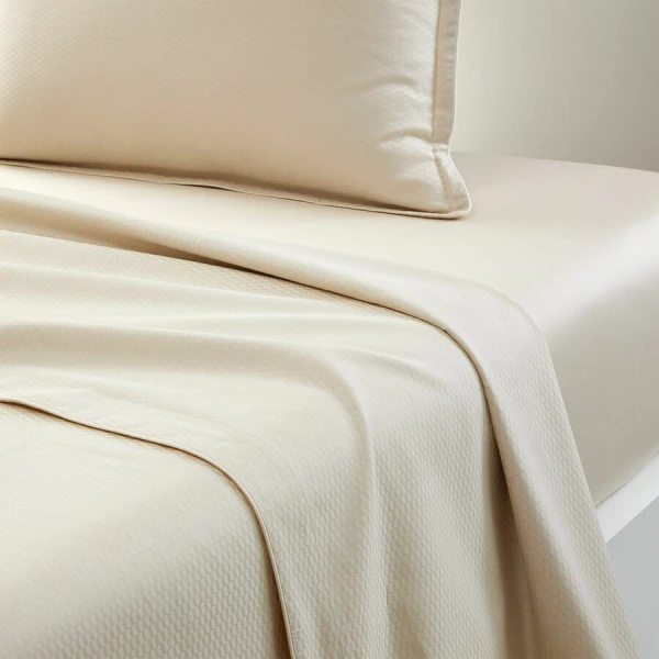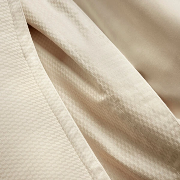 Designed by Hugo Boss and produced by the Yves Delorme Fremaux Family. Loft's bed linens composition is a Jacquard weave with micro-tiling gives these bed linens a contrasting matte and shiny appearance. Shams have coordinated piping. Cotton jacquard sateen and plain sateen at back, 300TC.