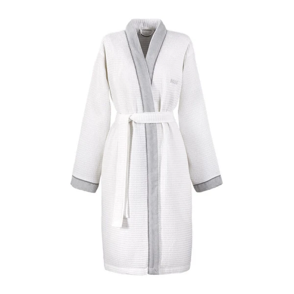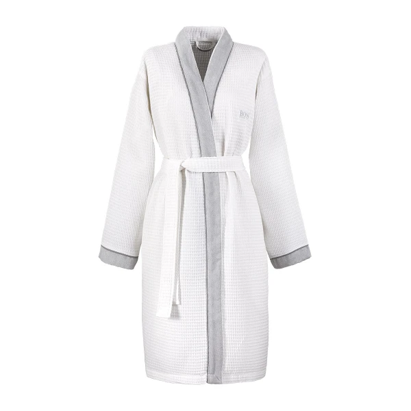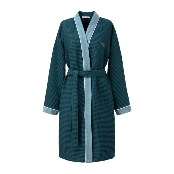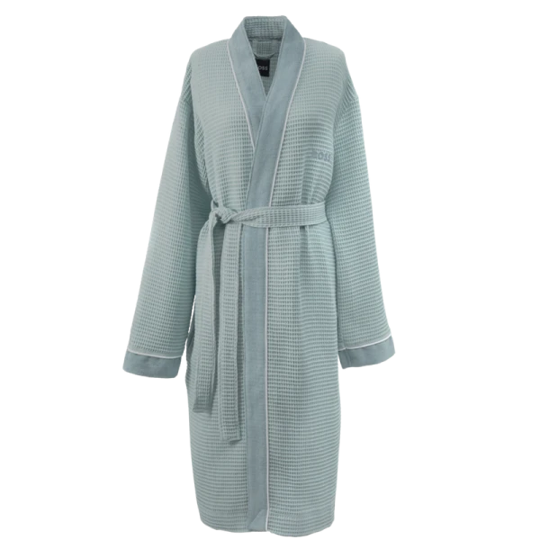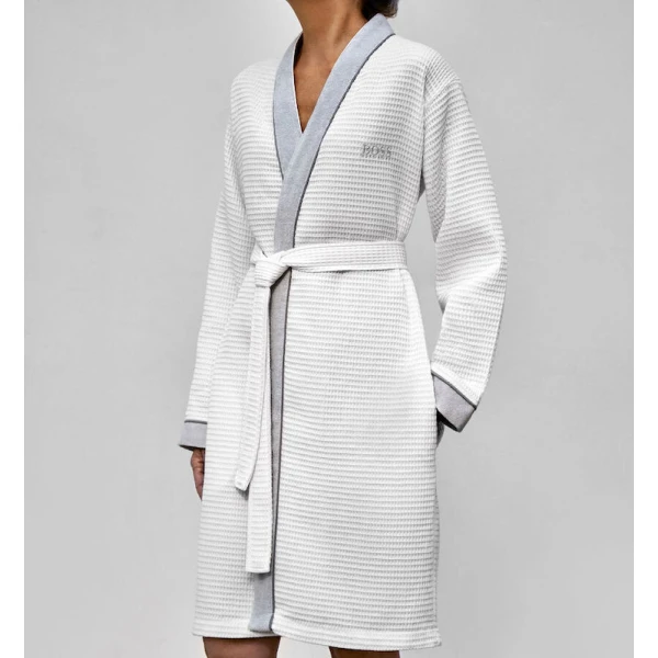 Hugo Boss' Therms is a kimono for both men and women.  The kimono has a waffle weave body and contrasted terry on front panel and end of sleeves. Belt closure. 100% cotton.