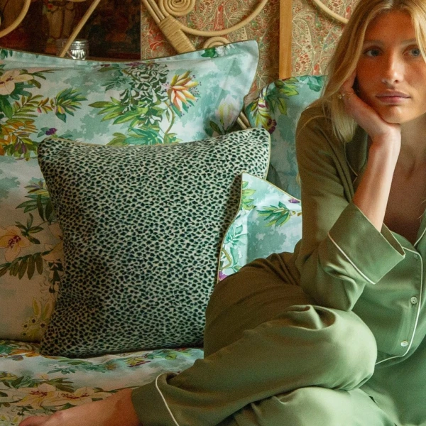 Yves Delorme's Zenaide Decorative Pillow in Paon features a bold leopard pattern, bringing a touch of refined exoticism to any space. Crafted in velvet on both the front and back, it promises unrivaled softness and a subtle sheen. Velvet decorative pillow. Velvet on both sides. Piping finish. Bottom zip closure. 40% Viscose, 36% Acrylic, 17% Cotton, 7% Polyester. Made in Belgium.