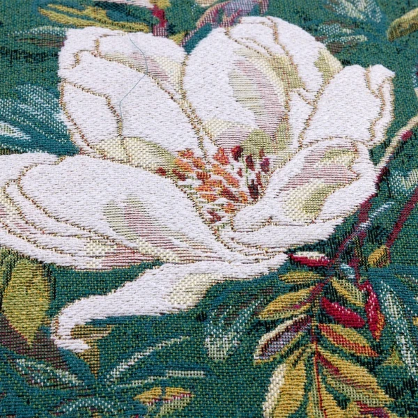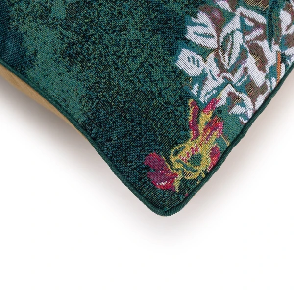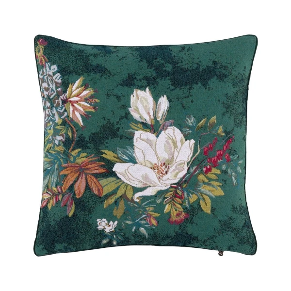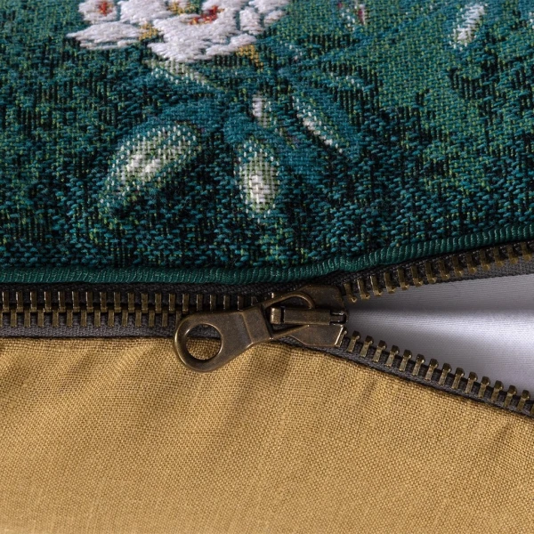 Yves Delorme's Panorama Decorative Pillow Decorative Pillow in Paon has a delicate tapestry flower on the front, contrasting elegantly with its plain linen back in Bronze. This work of textile art marries the intricacy of tapestry with the elegant simplicity of linen, offering a touch of refinement and comfort to any interior. Tapestry front. Back in Bronze linen. Piping finish. Bottom zipper fastening. Composition : 74% Cotton, 12% Acrylic, 6% Polyamide, 5% Polyester, 3% Viscose. Back: 100% Linen. Down & feather insert included. Made in Belgium.
