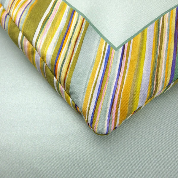 Yves Delorme Luciole Counterpane (Footquilt) is quilted front and back. Luciole is on striped silk, shades mingle delicately, from soft green to lilac, to create a soothing, poetic ambience. 100% silk. Quilted bed runner. Printed front and back. Padding: 100% polyester. Simple finish.