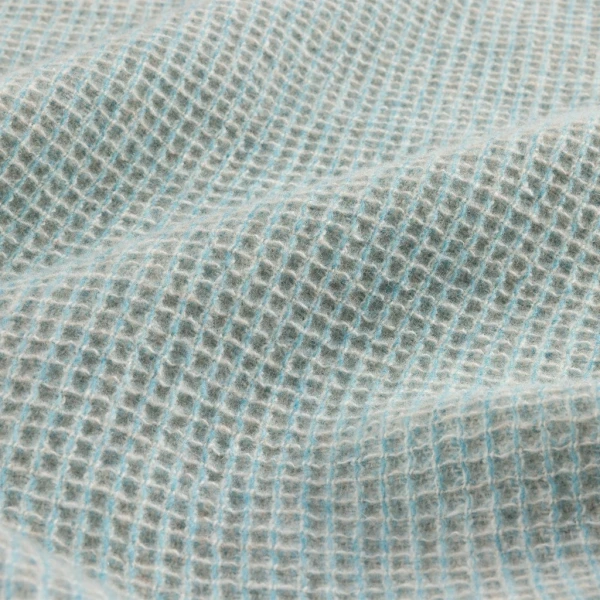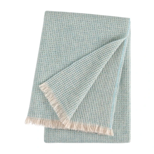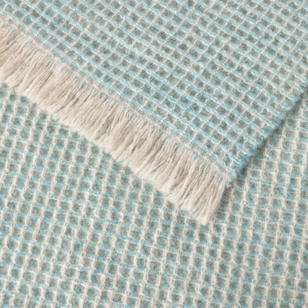 Yves Delorme's Cosy Throw in Aqua is perfect for cuddling and staying warm. Woven from two different shades of a soft virgin wool in a waffle weave, the blanket is trimmed with a fringed finish.