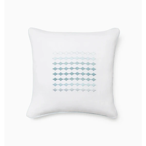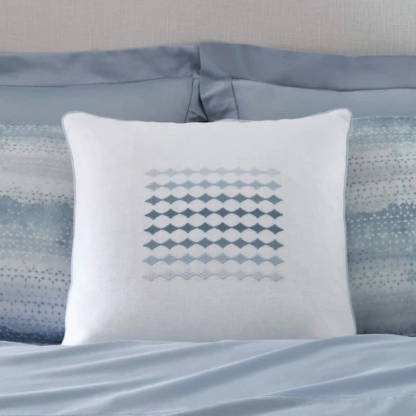 Sferra's Ortona Decorative Pillow is embroidered in soft shades of sky blue on pure white linen, its diamond motif evokes the precision of mosaic tilework and the softness of hand-drawn pattern. A contrast edge adds definition, gently framing the design without distraction. Crafted with mastery, Ortona brings a sense of balance and calm to the bed, sofa, or armchair. Ortona is a quiet exploration of symmetry and craft. Machine Embroidery. Contrast Piped Edge. 100% Linen.  Lithuania.