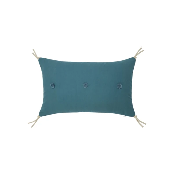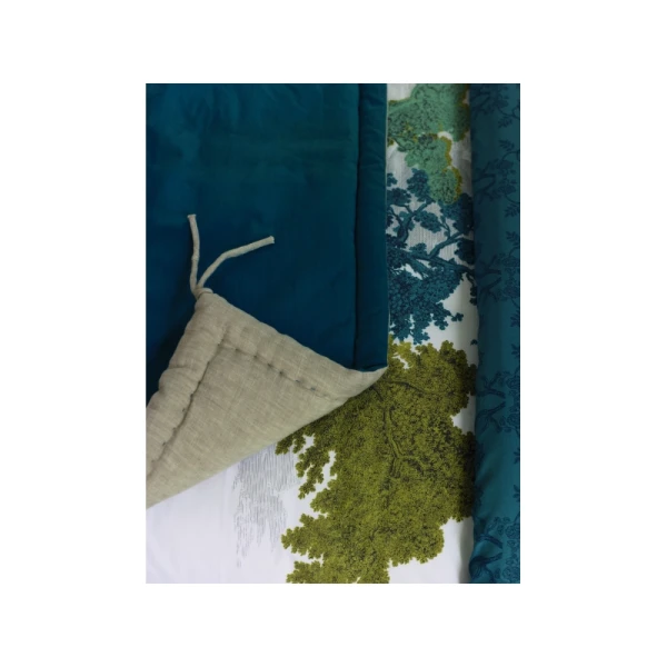 Egyptian Cotton printed percale bedding collection. Designed to complement is the decorative pillow, finished in cotton on the blue side and 100% natural linen on the reverse. The oblong pillow has three "knots" on the front and linen ties in the corner. The footquilt is made the same way with periodic knots holding the quilt together.