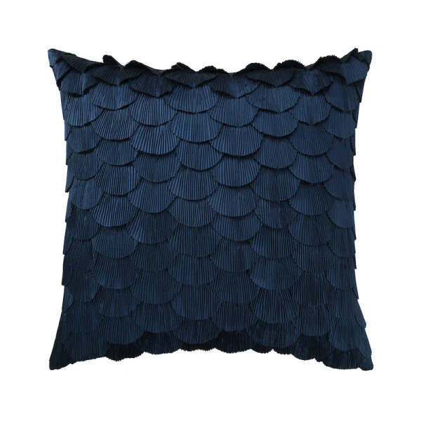 A favorite Yves Delorme decorator pillow, Ombelle has been brought out in almond and prusse (navy).  Pleated fans are attached in a cascading pattern on an all cotton pillow. Zipper closure -- ships with 95/5 feather/down insert.