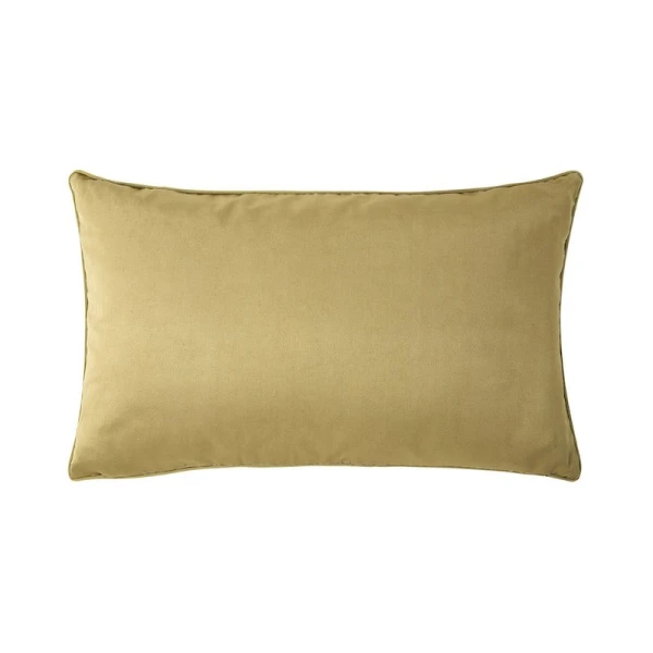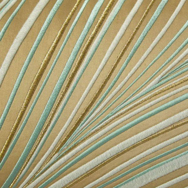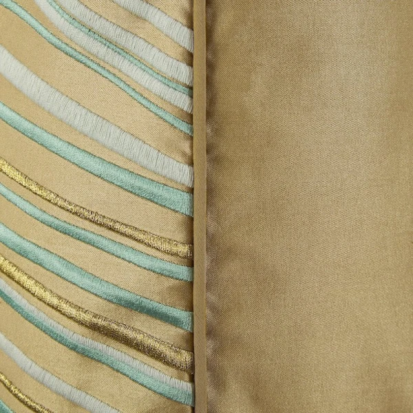 Yves Delorme's Au Loin Decorative Pillow is exquisite.  Colors are gold and aqua that look like rays of sunshine reflecting on the ocean.  A perfect accompaniment to the Au Loin Bedding Collection. It is embroidered front reversing to solid back with zipper closure, 13 in x 22 in. 65% cotton - 35% silk.