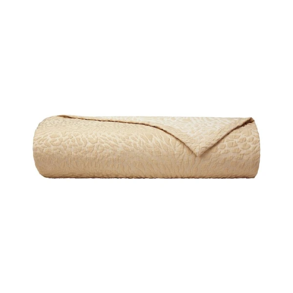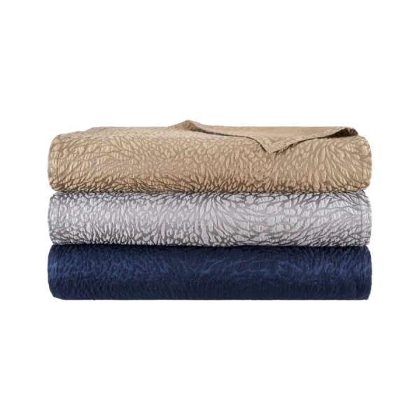 Yves Delorme's Souvenir Coverlet has a wonderful look that is versatile. It is a textured fabric that adds dimension and character to any bed. Finished with 1 inch hem and mitered corners. 64% cotton / 24% acrylic / 12% silk.