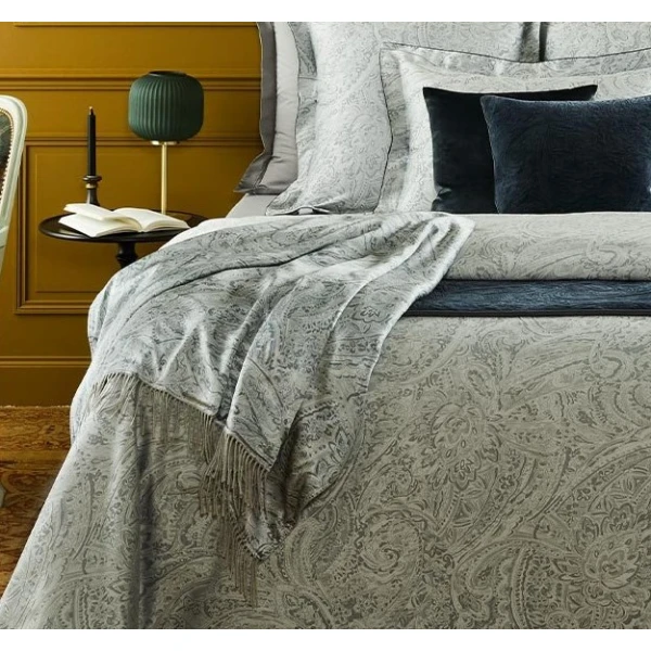Yves Delorme's Foulard is a luxurious throw that has a design that emulates the Foulard bedding pattern. A true classic in a foulard paisley in shades of grey, this throw is equally comfortable in a living room. This is a very luxurious tone on tone silk that will transport you to distant lands. It is printed on 100% silk on the front. Solid color 100% cashmere in a complementary grey on the back. 51'' x 67'', fringes finish. Made in Lithuania for Yves Delorme.