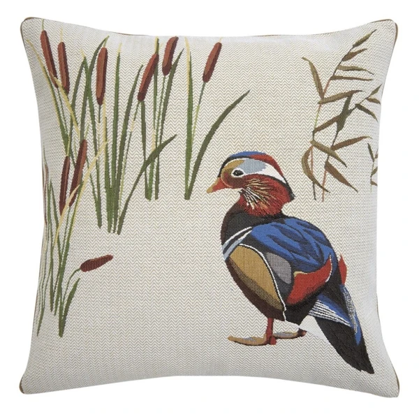 Edgar Solo Blanc Decorative Pillow by Iosis is full of charm and personality–it is designed and carefully crafted with brilliant and stunning details. The accent pillow features a Mandarin duck with cattail grass woven on a neutral background with a subtle chevron pattern. The Mandarin duck throw pillow reverses to a plain woven chevron on the back. It has an invisible zipper and piped finishing. 18" x 18" Down and feather insert included. Dry Clean Only.