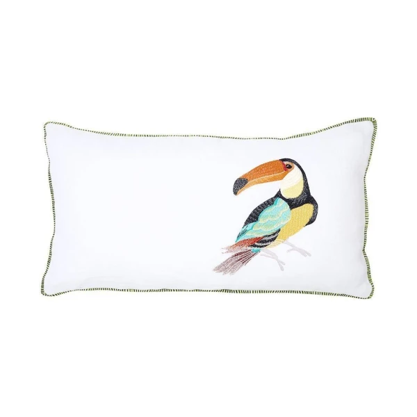A stunning bird the Toucan with its bright marks and large colorful bill. This one is embroidered on a white linen pillow. Iosis pillows come with a hidden zipper at the bottom with a complimentary colored piping finish around the pillow. Back of pillow is plain. Designed in Paris. Made in France. Pillow is 13" x 22". Down and feather insert is included. Dry clean only.