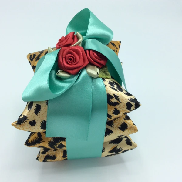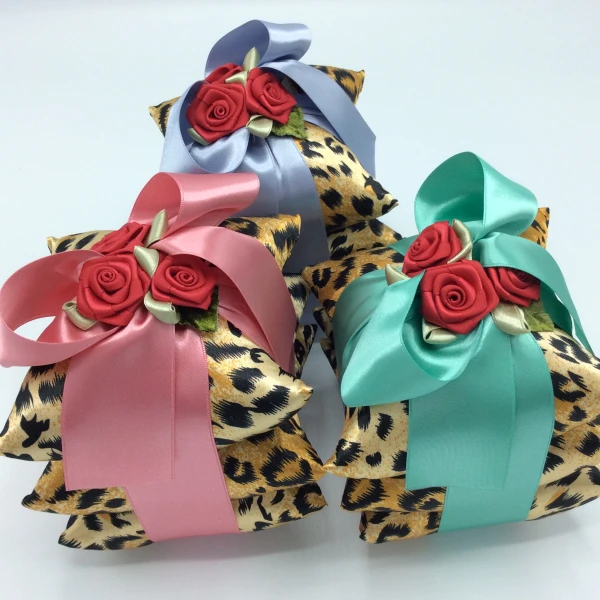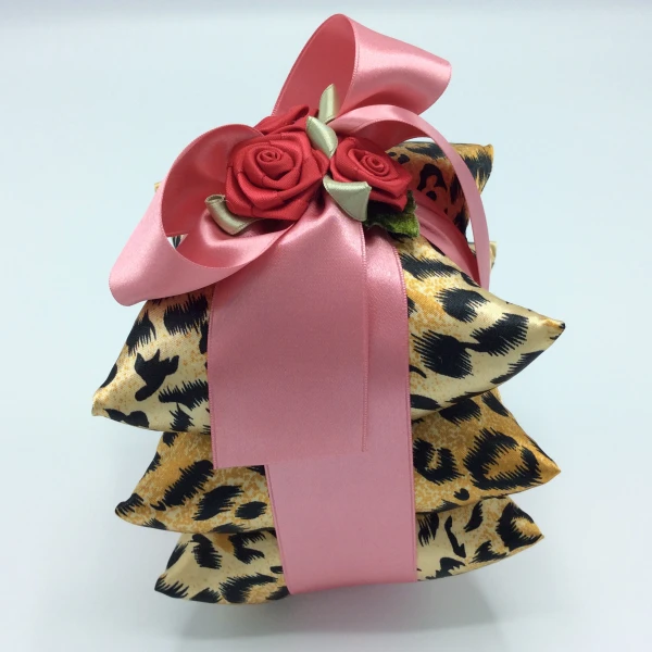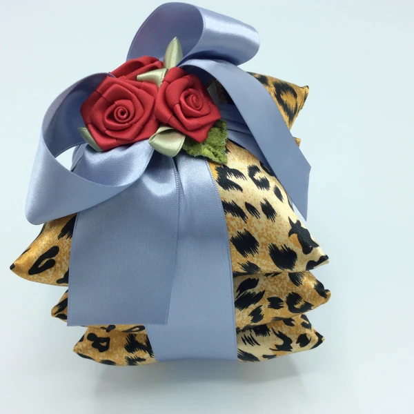 A stack of three silk pillow sachets tied with a beautiful french blue ribbon and topped with three red silk rosettes -- from Irene Hirose.  Beautiful presentation and a very scented for the drawer. Filled with Irene Hirose's signature scent.