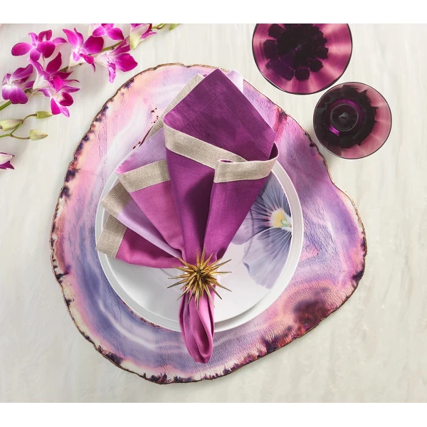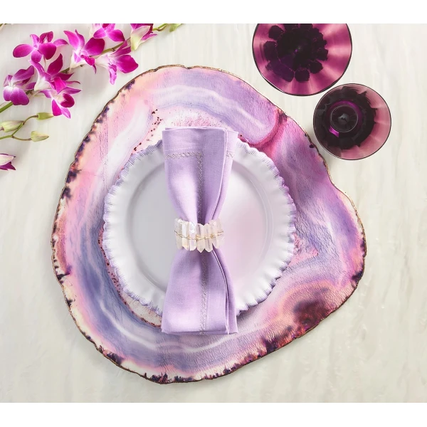 Kim Seybert's Amethyst Placemats were inspired by the natural beauty of the amethyst crystal, a violet variety of quartz. The purple placemat’s design mimics a slice of agate with its saturated hues of lilac, lavender and plum rings. A sleek resin finish elevates this organic-shaped placemat, while its acrylic material makes it easy to clean. 70% MDF, 20% Acrylic, 10% Cork. 16" Length x 15.5" Width x 0.25" Height.