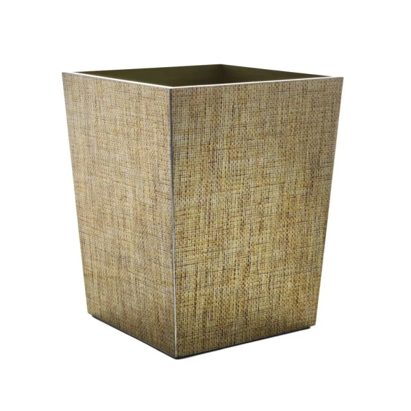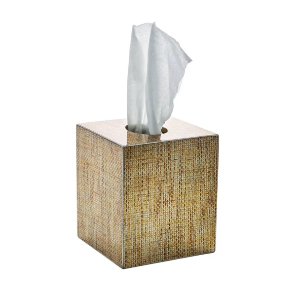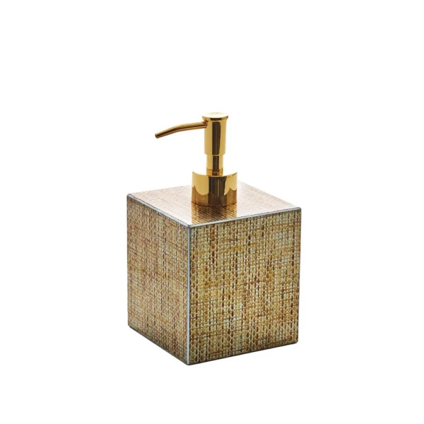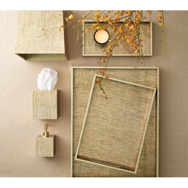 Angkor, from Kim Seybert, has the colors of Cambodia's ancient ruins and temples make their way into our vanity collection. Lacquered raffia with gold accents form these powder room essentials which include a tissue box, soap dispenser, vanity tray and waste basket. Get the full set for a stylish and cohesive look.