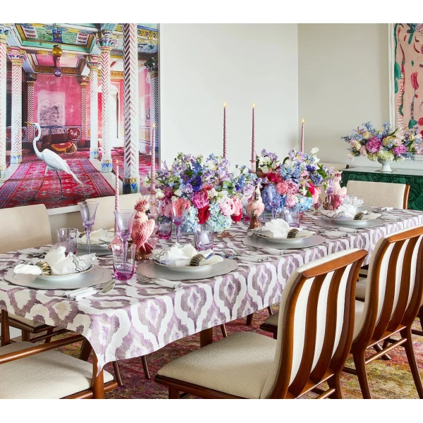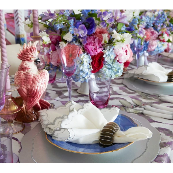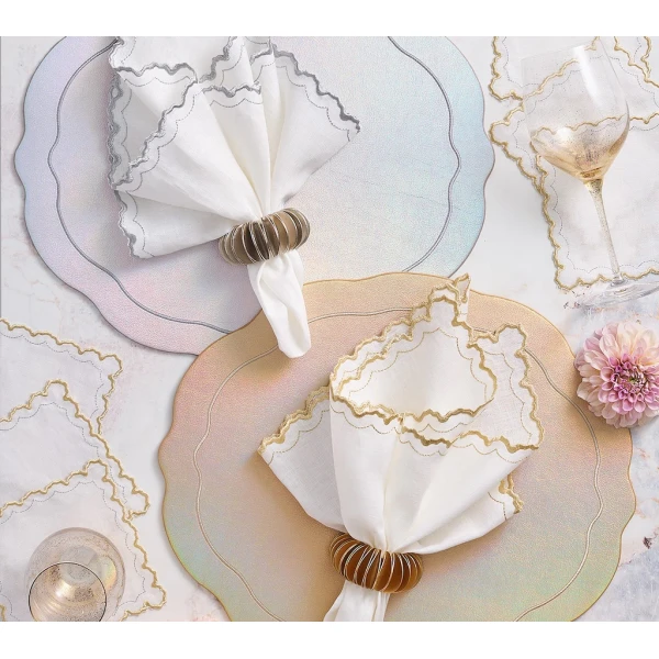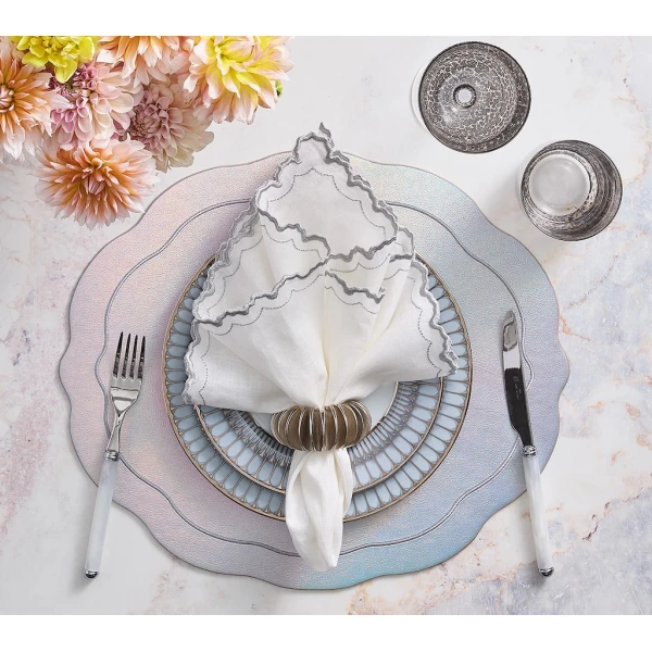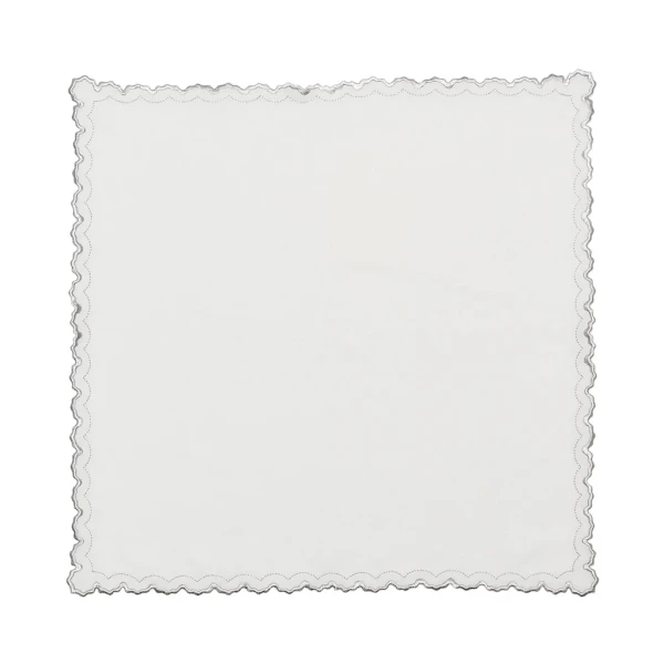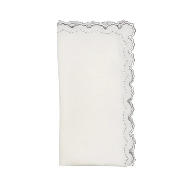 Kim Seybert's Arches Napkin in White & Silver has a thick embroidered geometric edge accented by delicate pick-stitching. Its harmonious, monochromatic border beautifully frames the entire napkin and creates a delicate contrast of texture that enhances the napkin's charm. Its versatile design seamlessly transitions from formal dining to more casual settings. 100% Linen.