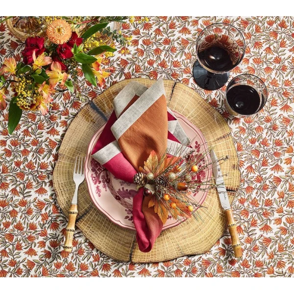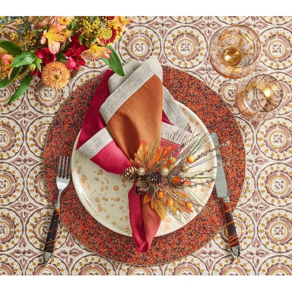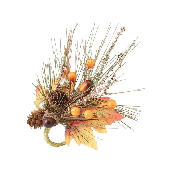 Kim Seybert's Autumn Spray rings are a symbol of the harvest spirit. Autumnal elements such as acorns, pinecones, gold berries, and faux leaves and branches are combined to create a festive fall arrangement perfect for fall home decor. Add this seasonal delight to your table for family and friends. 30% Styrofoam, 30% Plastic, 20% Iron, 10% Pinecone, 10% Polyester.