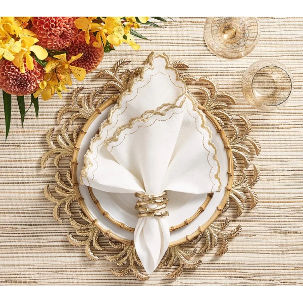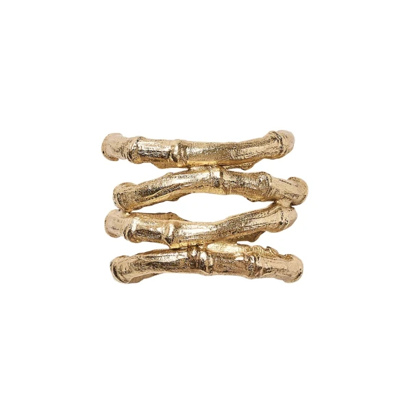 Kim Seybert's Bamboo Napkin Ring in Gold features bamboo stalks arranges in a dazzling round shape. This faux bamboo metal cuff elegantly encases your napkins with its gold plating. It can fit into aesthetics as wide ranging as Hollywood Regency to coastal glamour. 2.25†Length x 1.5†Width x 1.75†Height. 99.5% Aluminum, 0.5% Plated Brass.
