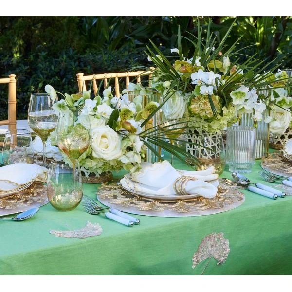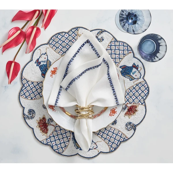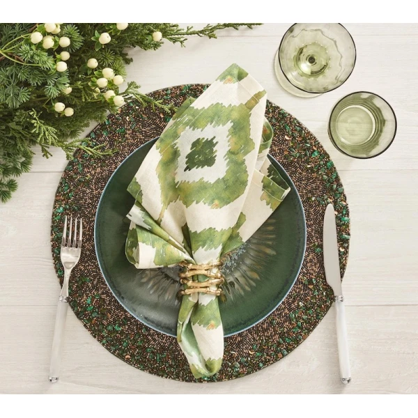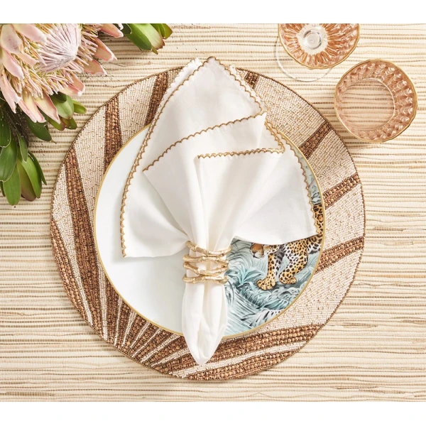 CARE: Wipe with a dry cloth. Use a soft toothbrush with mild soapy water for plastic and glass beaded napkin rings, if necessary.