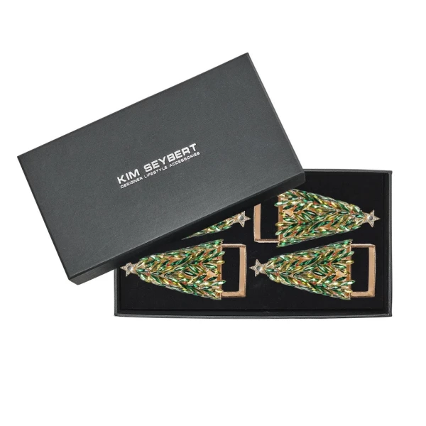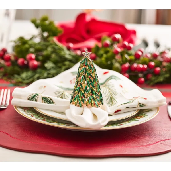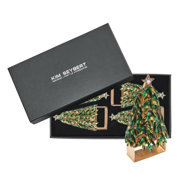 Kim Seybert's Bejeweled Xmas Napkin Rings showcase a magical jeweled Christmas tree decorated with festive trimmings. Various green gemstone leaves decorate the cone-shaped tree, while red baubles dance across its branches. Finished with a gemstone star topper, this iconic design adds the most festive touch to any Christmas table. 50% Metal, 40% Plastic, 10% Glass