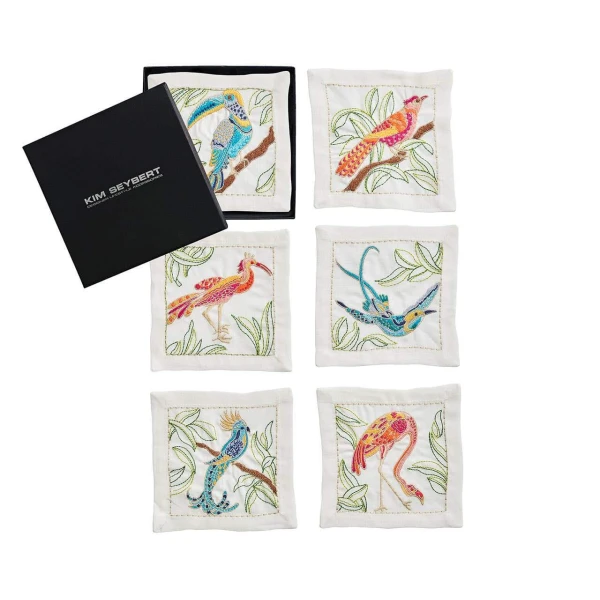 Kim Seybert's Birds of Paradise Cocktail Napkins feature six different exotic birds on a stark white linen napkin. Each bird is hand-drawn then intricately embroidered on the linen cocktail napkin. There is a delicate balance between the colorful embroidered birds and the subtle background greenery.  Gift boxed in a set of 6. 100% Linen.