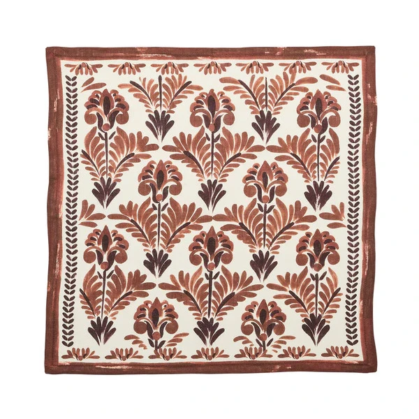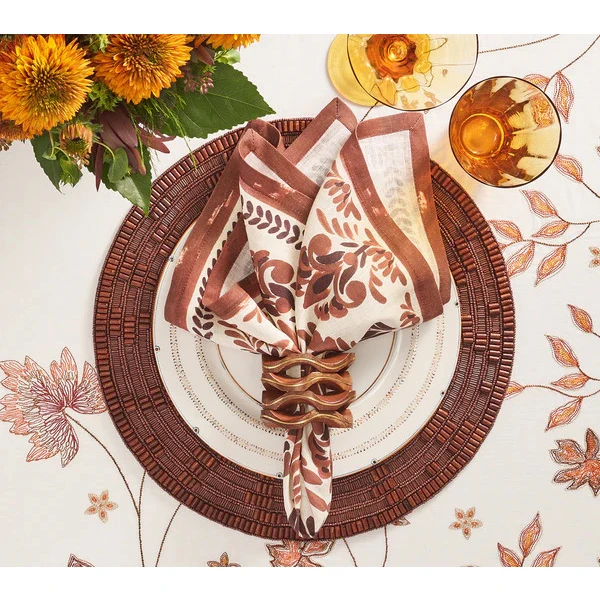 Adorn your fall table with the Botanica Napkin, from Kim Seybert, showcasing a harvest-inspired pattern in rich brown and gold colors. Hand-painted leaves, flowers and abstract shapes are digitally printed on linen, creating a playful and vibrant autumn design. This napkin adds the right amount of energy to your fall table setting, infusing it with a delightful touch of seasonal charm. 100% linen.  Sold in sets of four.  Shown with the wood matrix placemat and the Botanica napkin ring.
